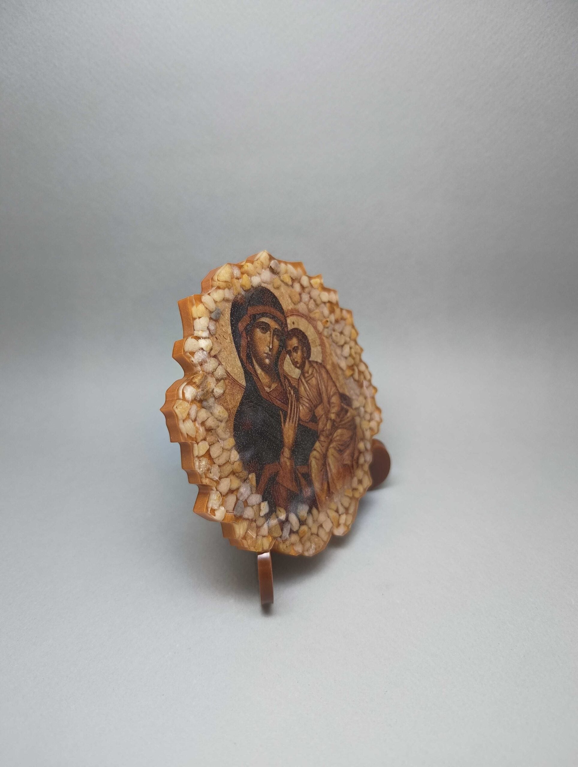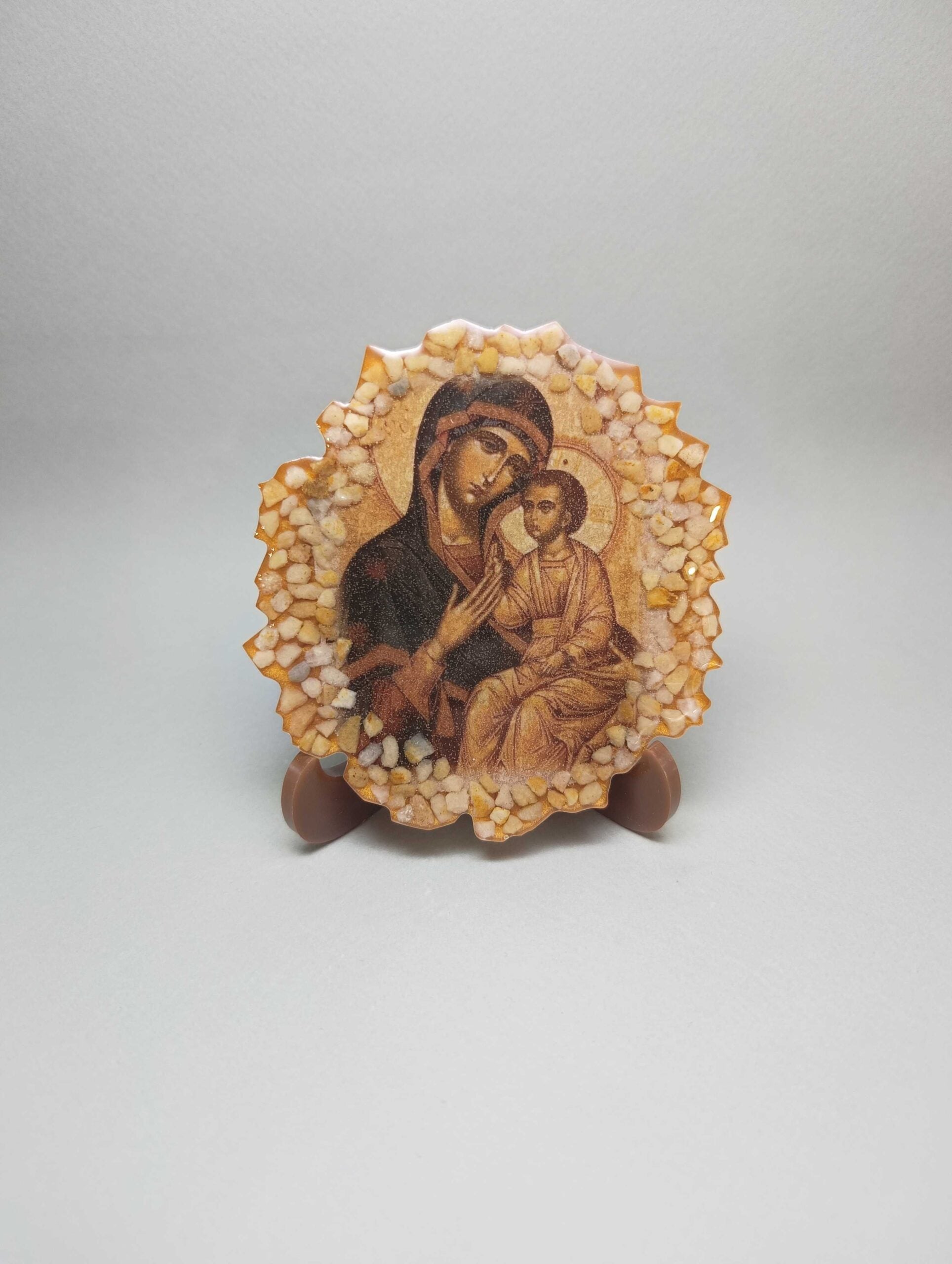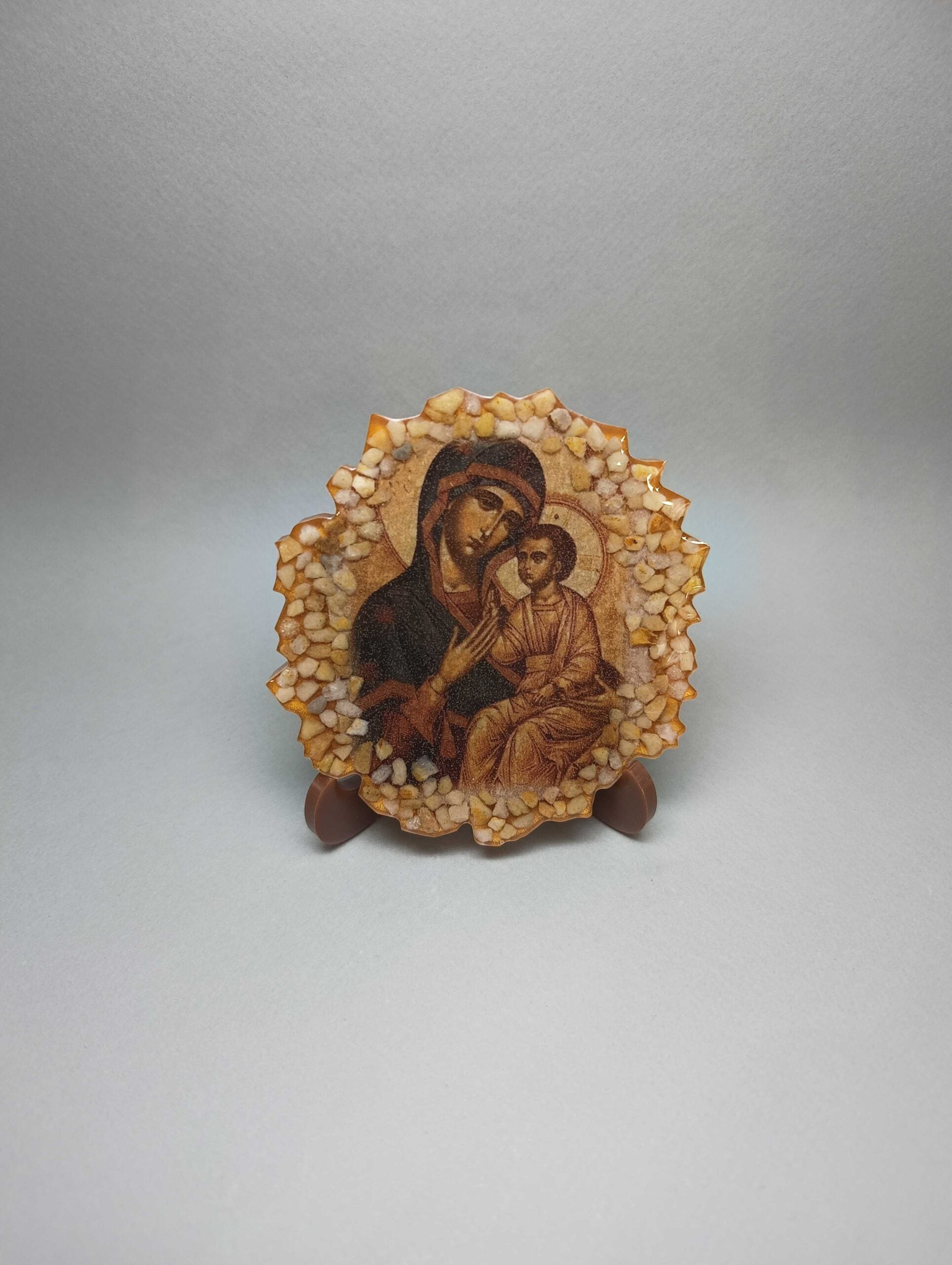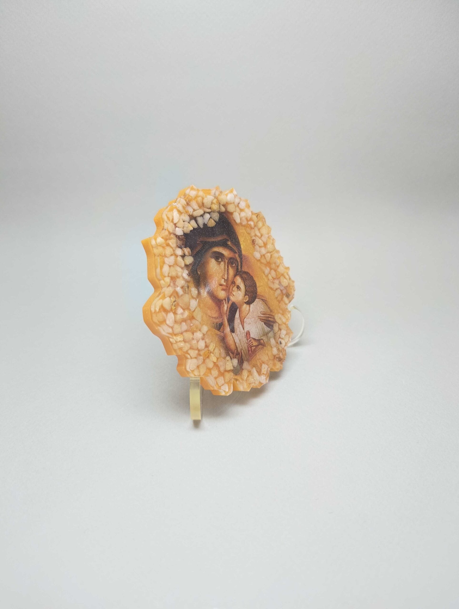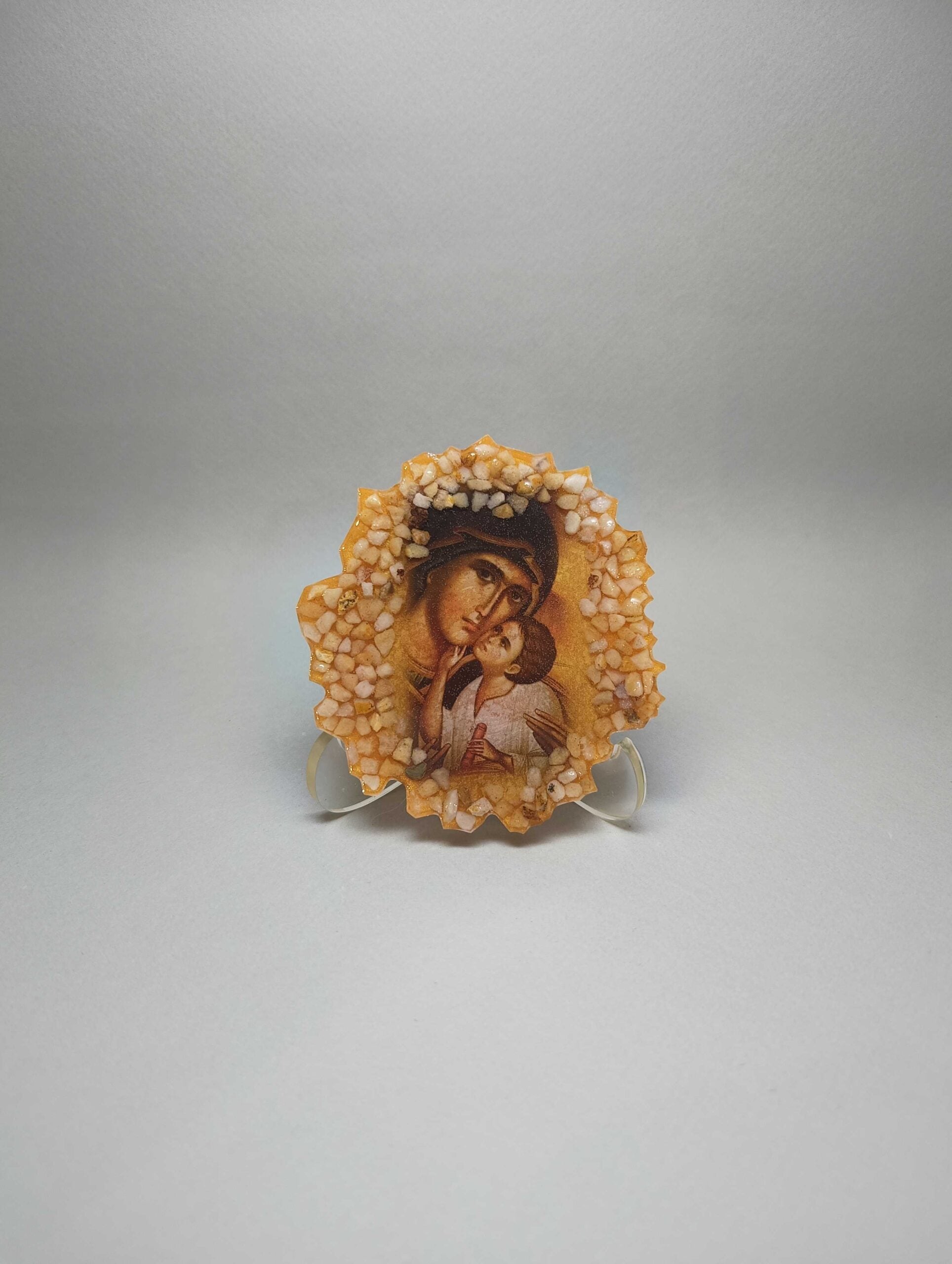 Ένα ξεχωριστό χειροποίητο διακοσμητικό από υγρό γυαλί και λευκές πέτρες, με την εικόνα της Παναγίας, δημιουργημένο με φροντίδα και σεβασμό στη λεπτομέρεια.