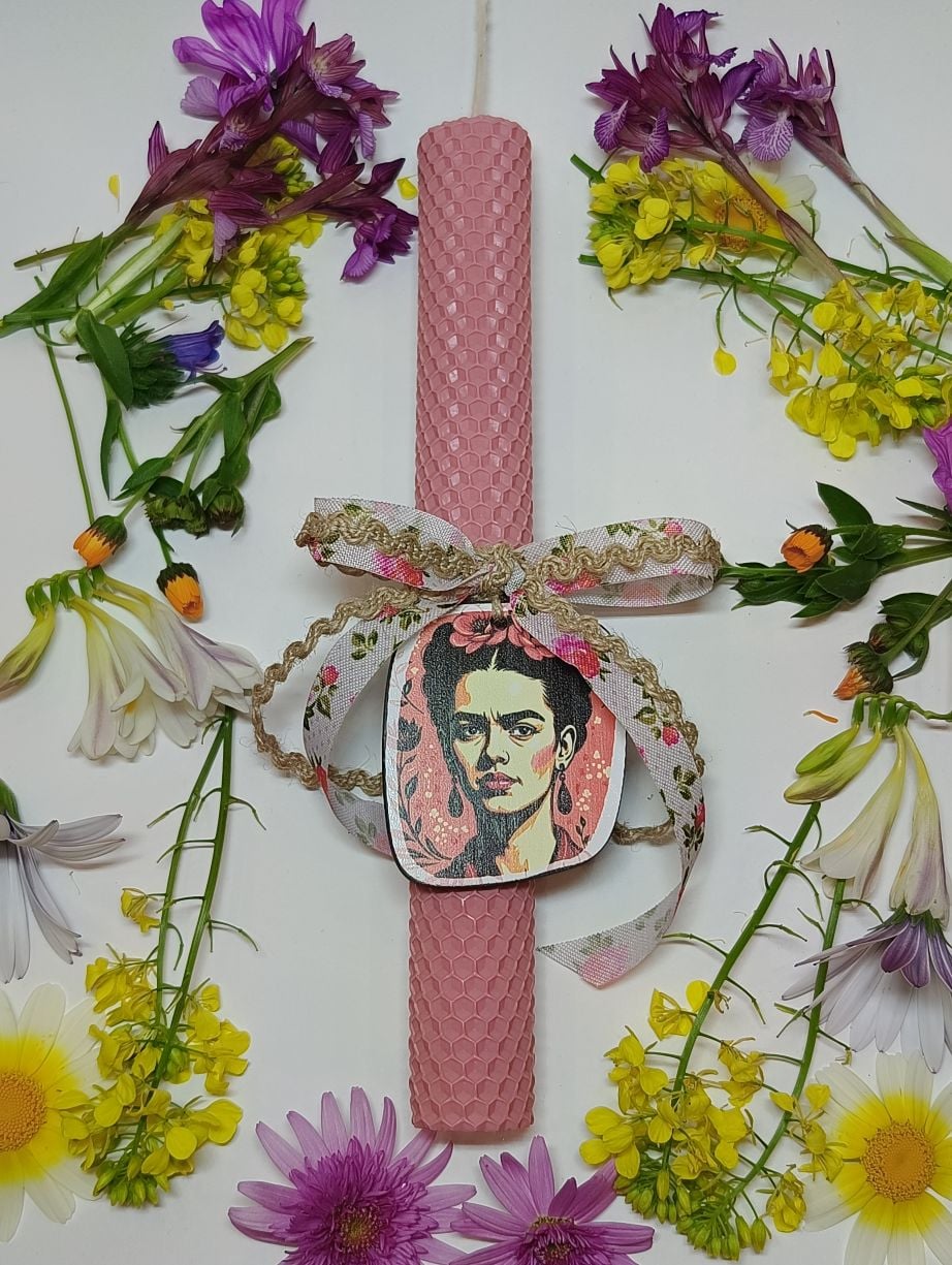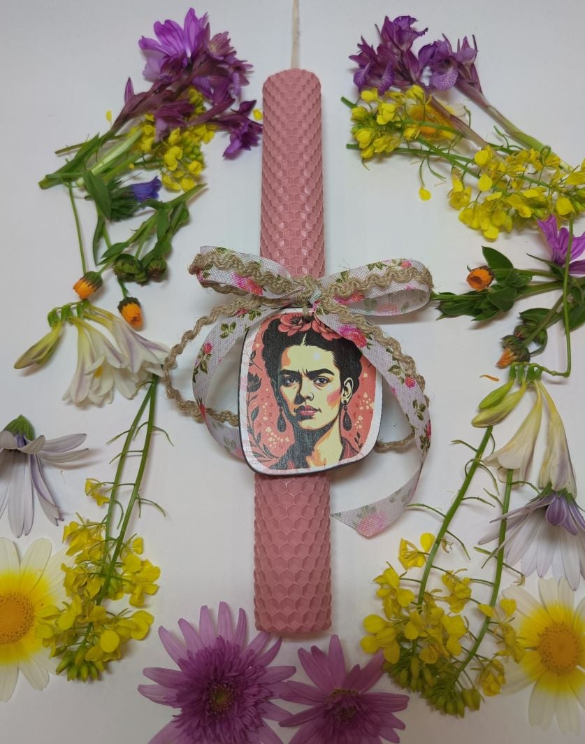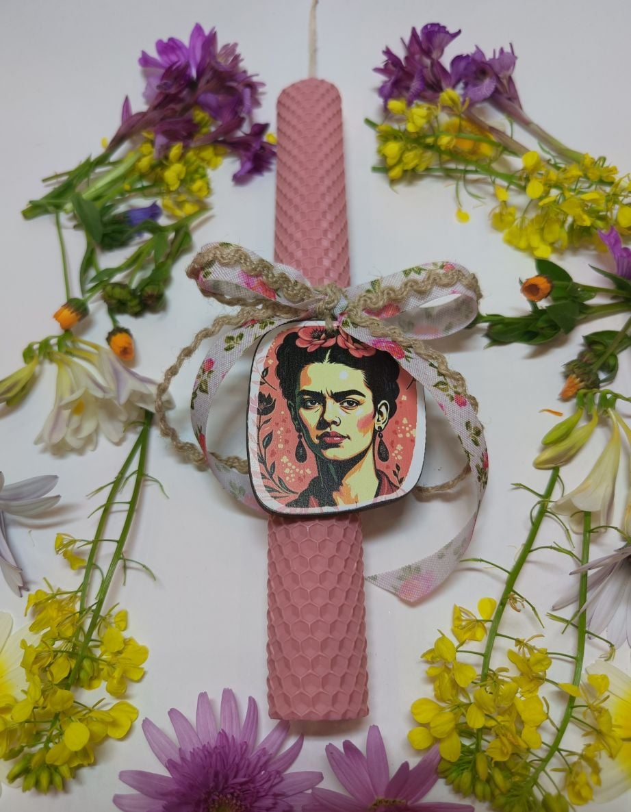 Μια ξεχωριστή πασχαλινή λαμπάδα με καλλιτεχνικό χαρακτήρα, εμπνευσμένη από τη δυναμική προσωπικότητα της Frida Kahlo. Η λαμπάδα είναι κατασκευασμένη από χρωματιστό φύλλο κηρήθρας σε απαλή ροζ απόχρωση, προσφέροντας μια ζεστή και κομψή αισθητική.
