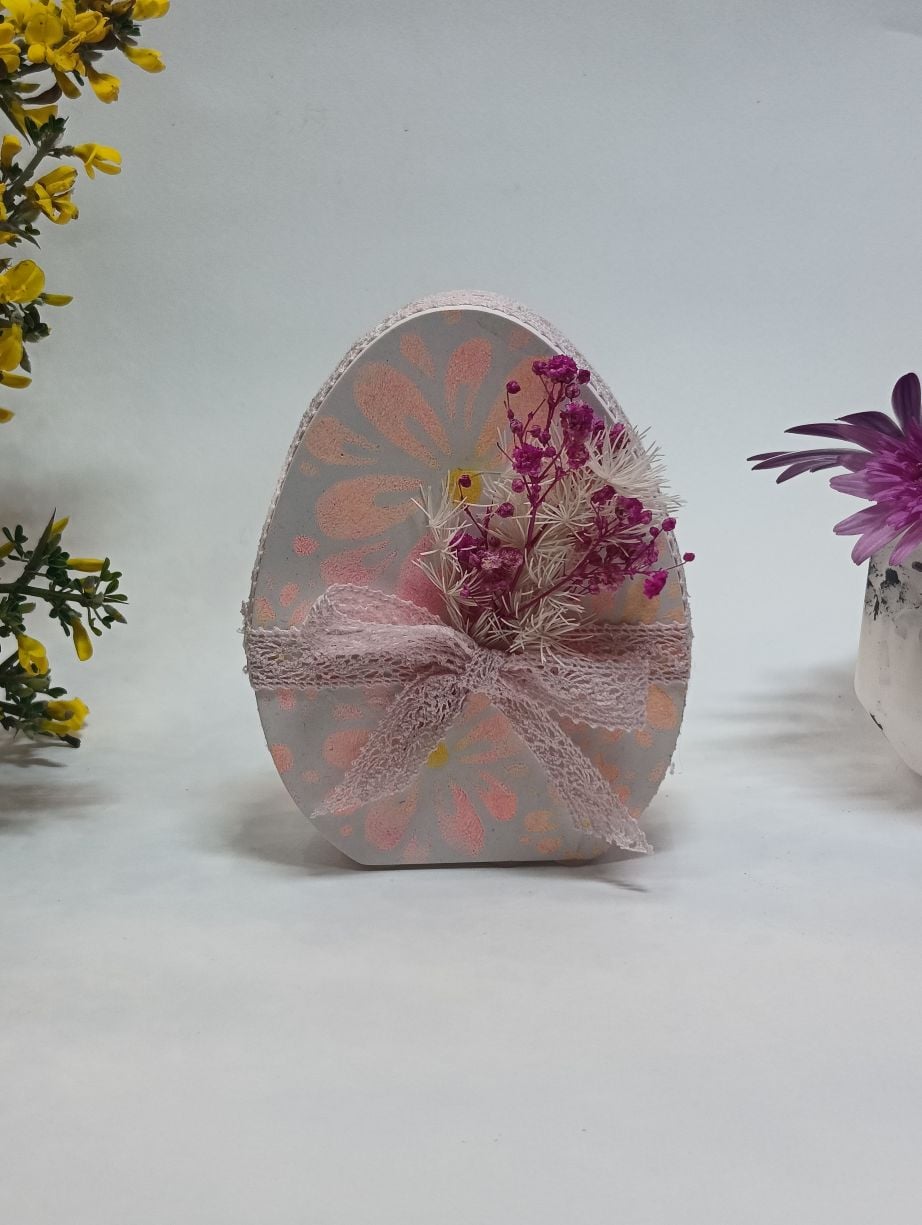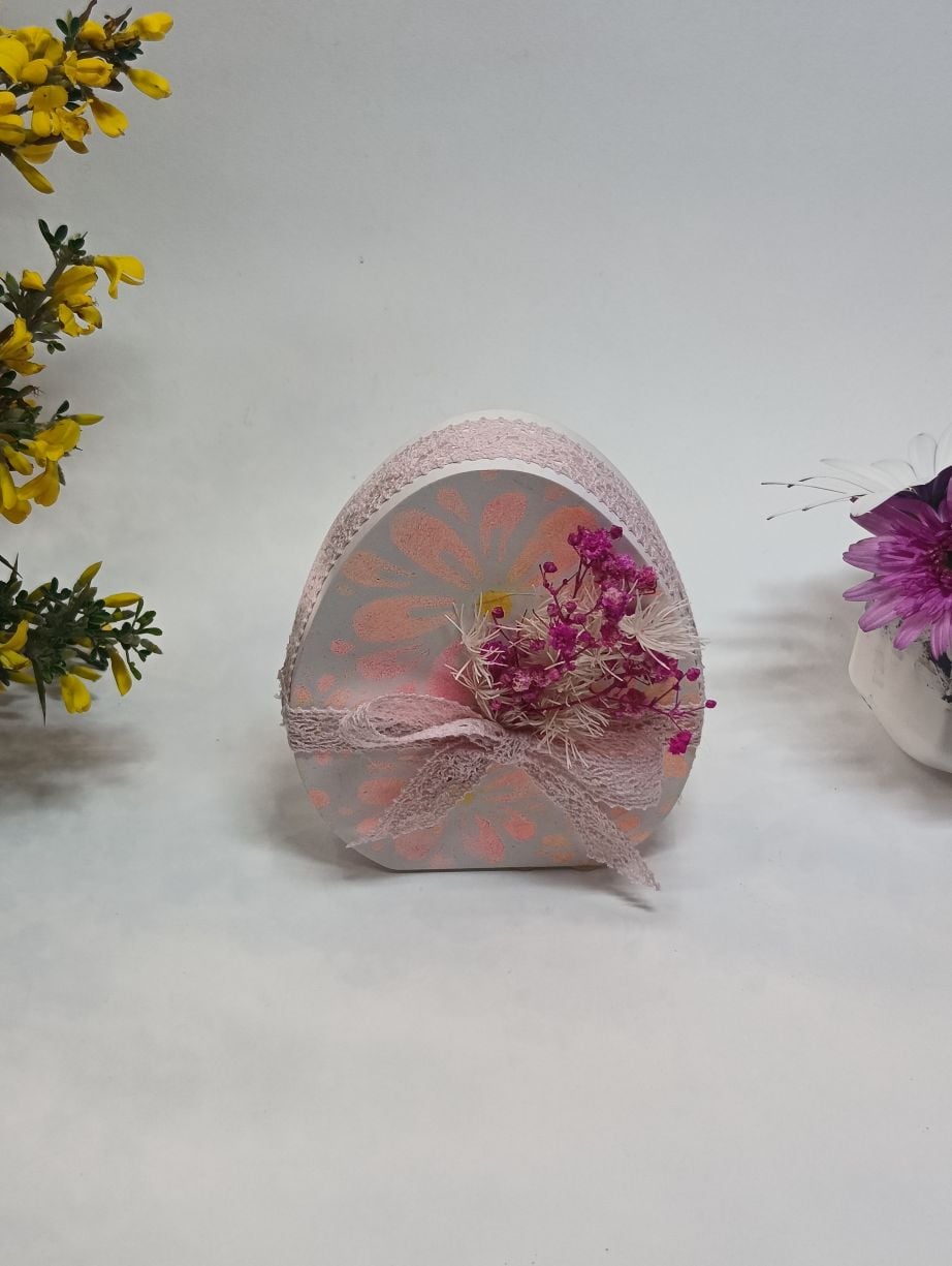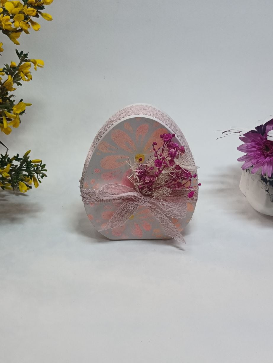 Με διαστάσεις 9cm μήκος και 11,50cm ύψος, το αυγό διακοσμείται σε απαλούς λευκούς και ροζ τόνους, με καλλιτεχνικά μοτίβα που θυμίζουν άνθη. Ο στολισμός ολοκληρώνεται με δαντελένια κορδέλα και αποξηραμένα λουλουδάκια σε ροζ αποχρώσεις, προσθέτοντας μια φυσική και ρομαντική πινελιά.