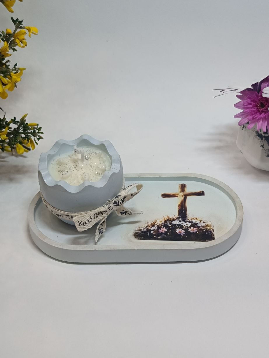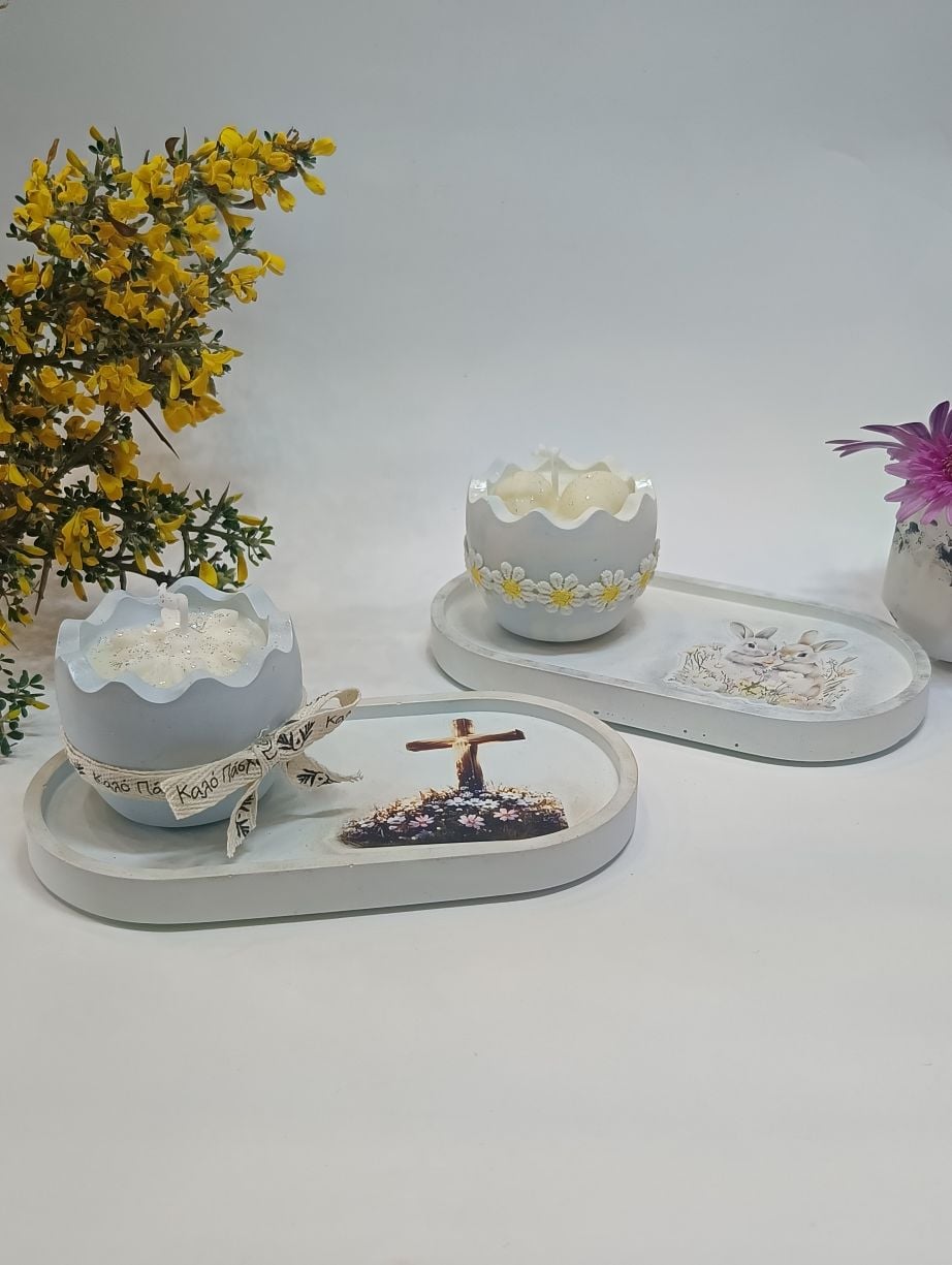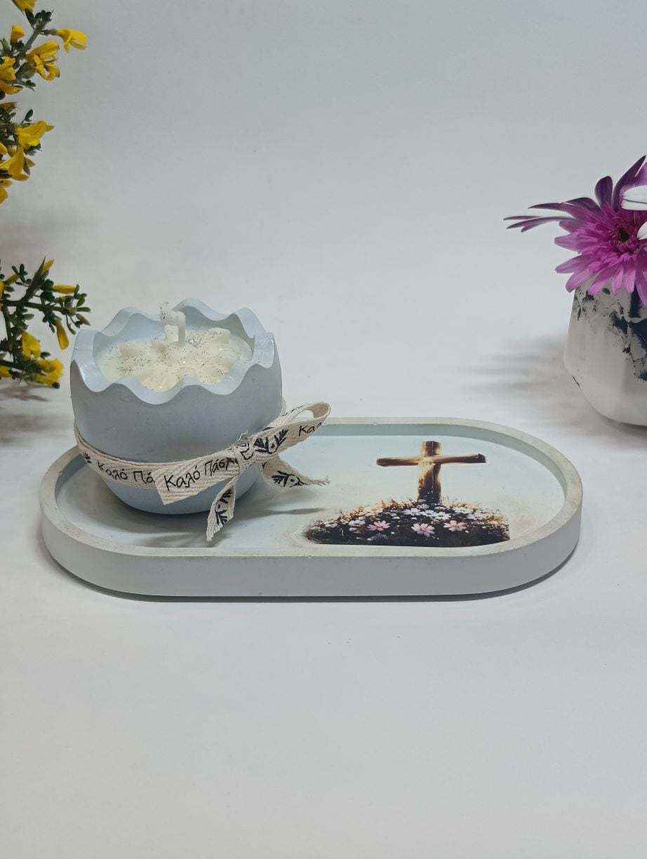 Η βάση διακοσμείται με εικόνα εμπνευσμένη από το Πάσχα, αποπνέοντας γαλήνη. Το βαζάκι-αυγό φιλοξενεί αρωματικό κερί με υπέροχο άρωμα τσουρέκι, ενώ στο εσωτερικό του ξεχωρίζουν πασχαλινά διακοσμητικά από το ίδιο κερί, προσθέτοντας μία μοναδική χειροποίητη πινελιά. Η σύνθεση ολοκληρώνεται με κορδέλα σε φυσικούς και χαρούμενους τόνους, χαρίζοντας μια ζεστή, πασχαλινή αίσθηση.