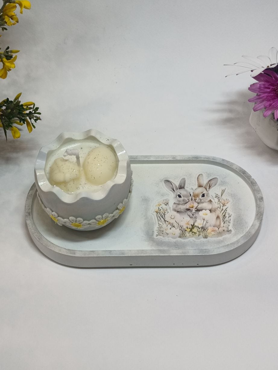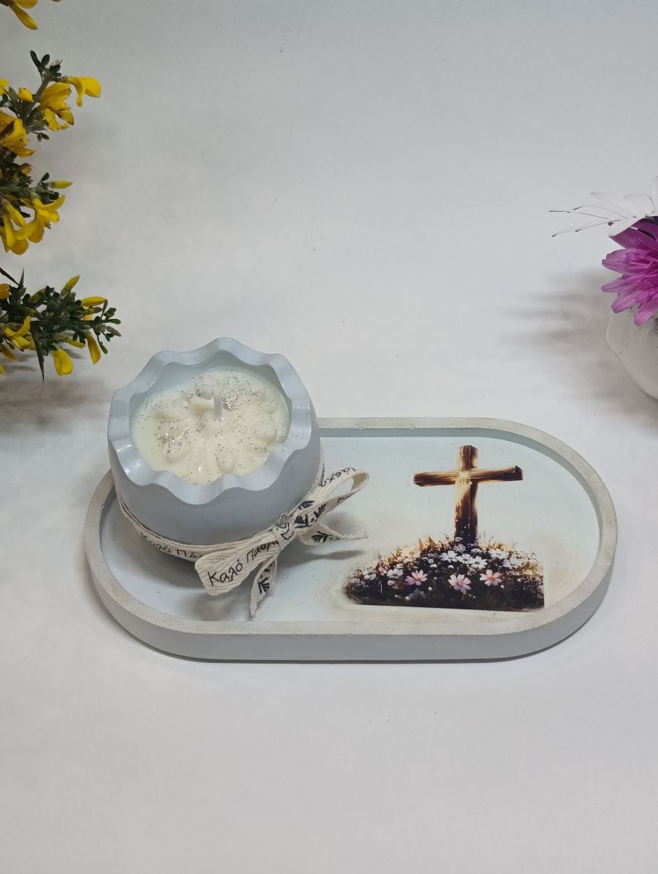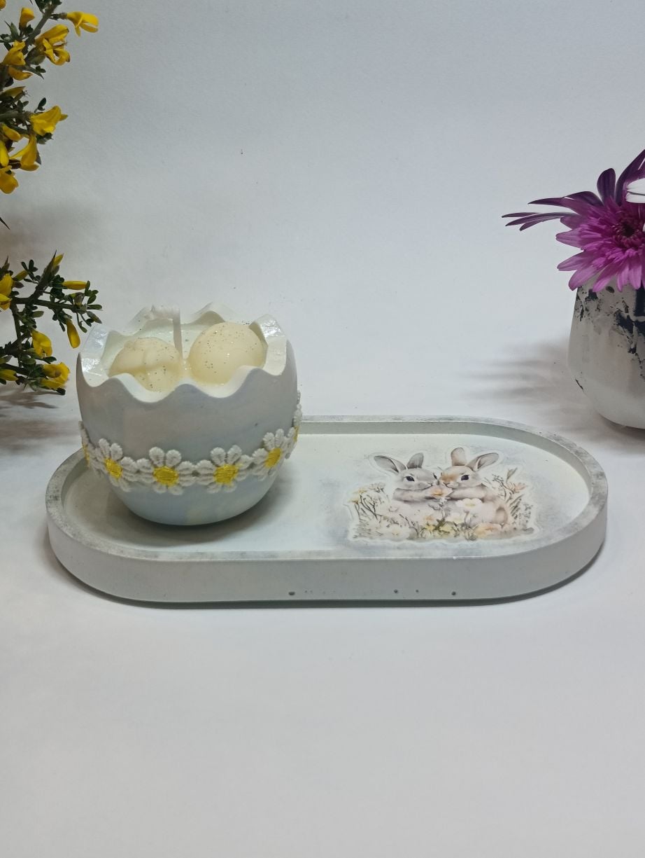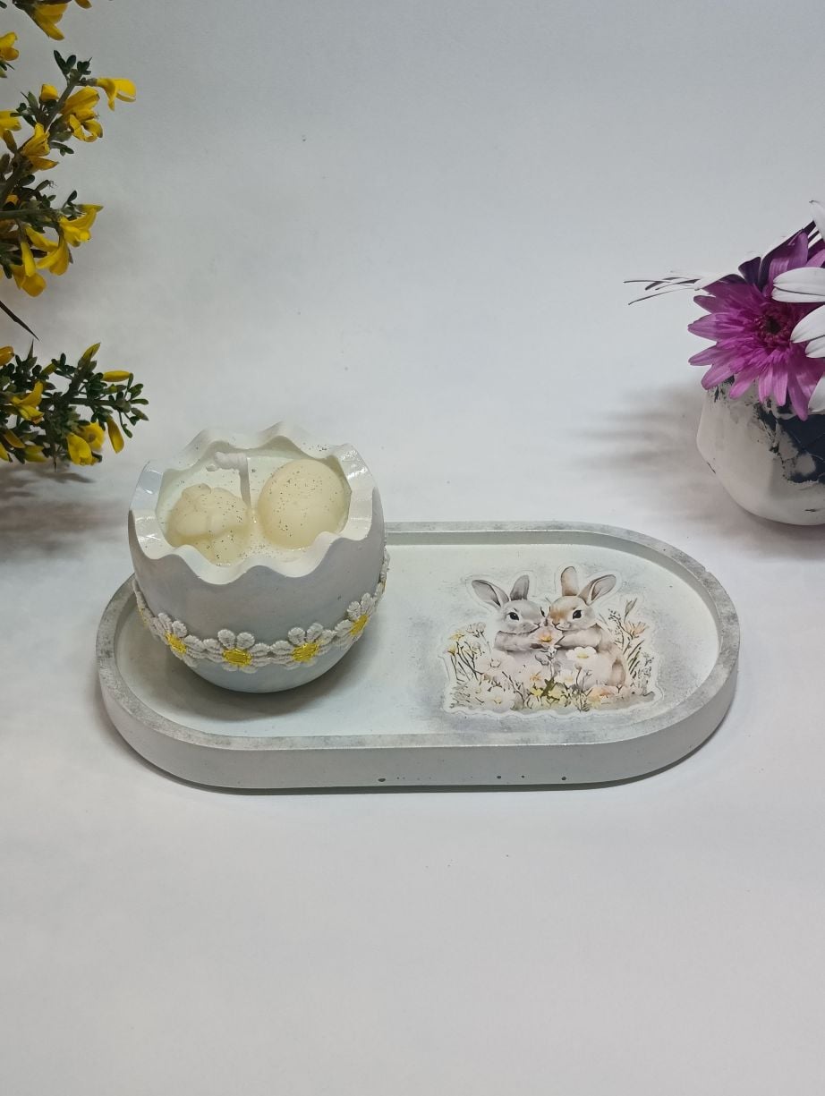 Η βάση διακοσμείται με εικόνα εμπνευσμένη από το Πάσχα, αποπνέοντας γαλήνη. Το βαζάκι-αυγό φιλοξενεί αρωματικό κερί με υπέροχο άρωμα τσουρέκι, ενώ στο εσωτερικό του ξεχωρίζουν πασχαλινά διακοσμητικά από το ίδιο κερί, προσθέτοντας μία μοναδική χειροποίητη πινελιά. Η σύνθεση ολοκληρώνεται με κορδέλα σε φυσικούς και χαρούμενους τόνους, χαρίζοντας μια ζεστή, πασχαλινή αίσθηση.