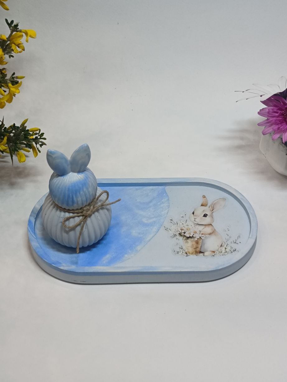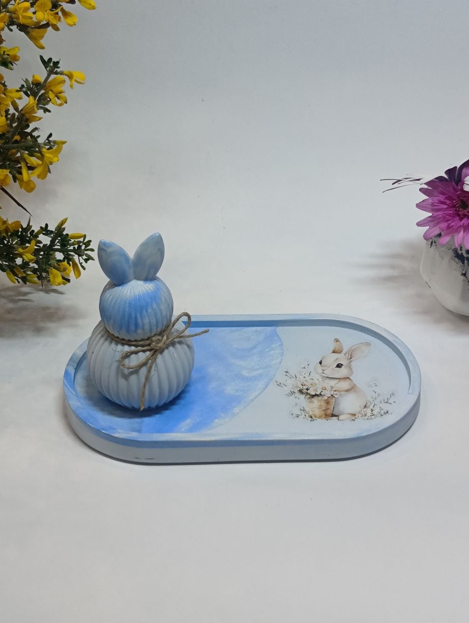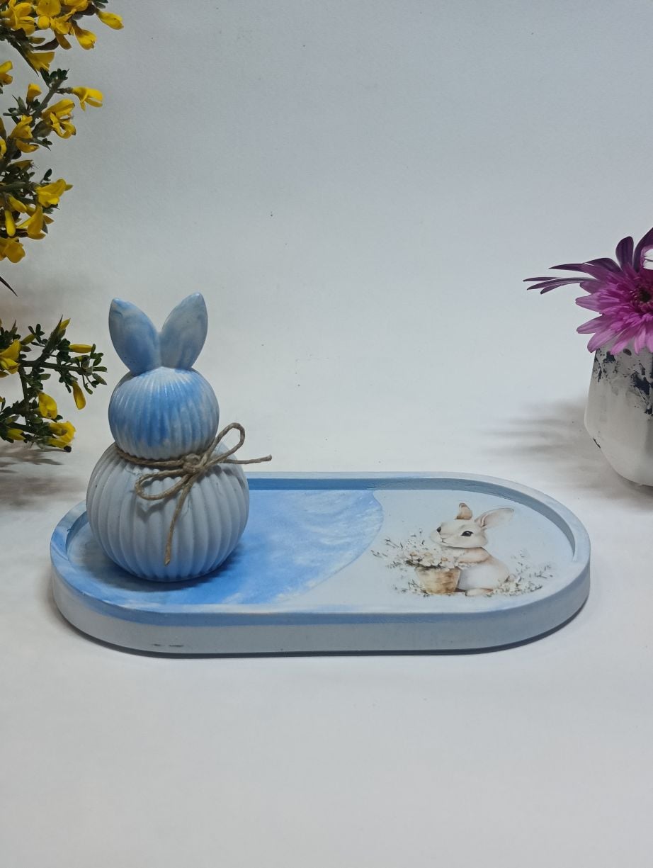 Ο δίσκος, σε απαλές γαλάζιες αποχρώσεις με διακριτικό σχέδιο λαγουδάκι, συνδυάζεται αρμονικά με το κεραμικό διακοσμητικό, το οποίο ξεχωρίζει για τη λιτή γραμμική υφή και τον φυσικό στολισμό με σπάγκο. Το αποτέλεσμα είναι ένα σύνολο που ισορροπεί ανάμεσα στη ρομαντική και τη μοντέρνα αισθητική.