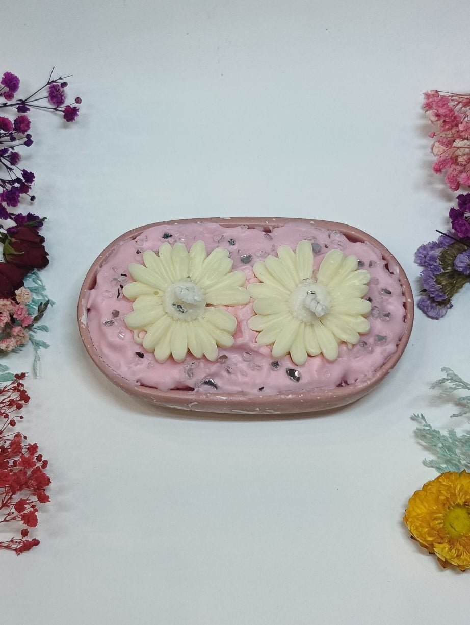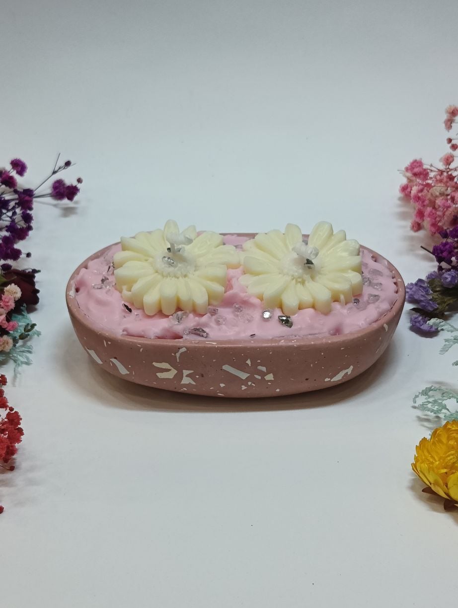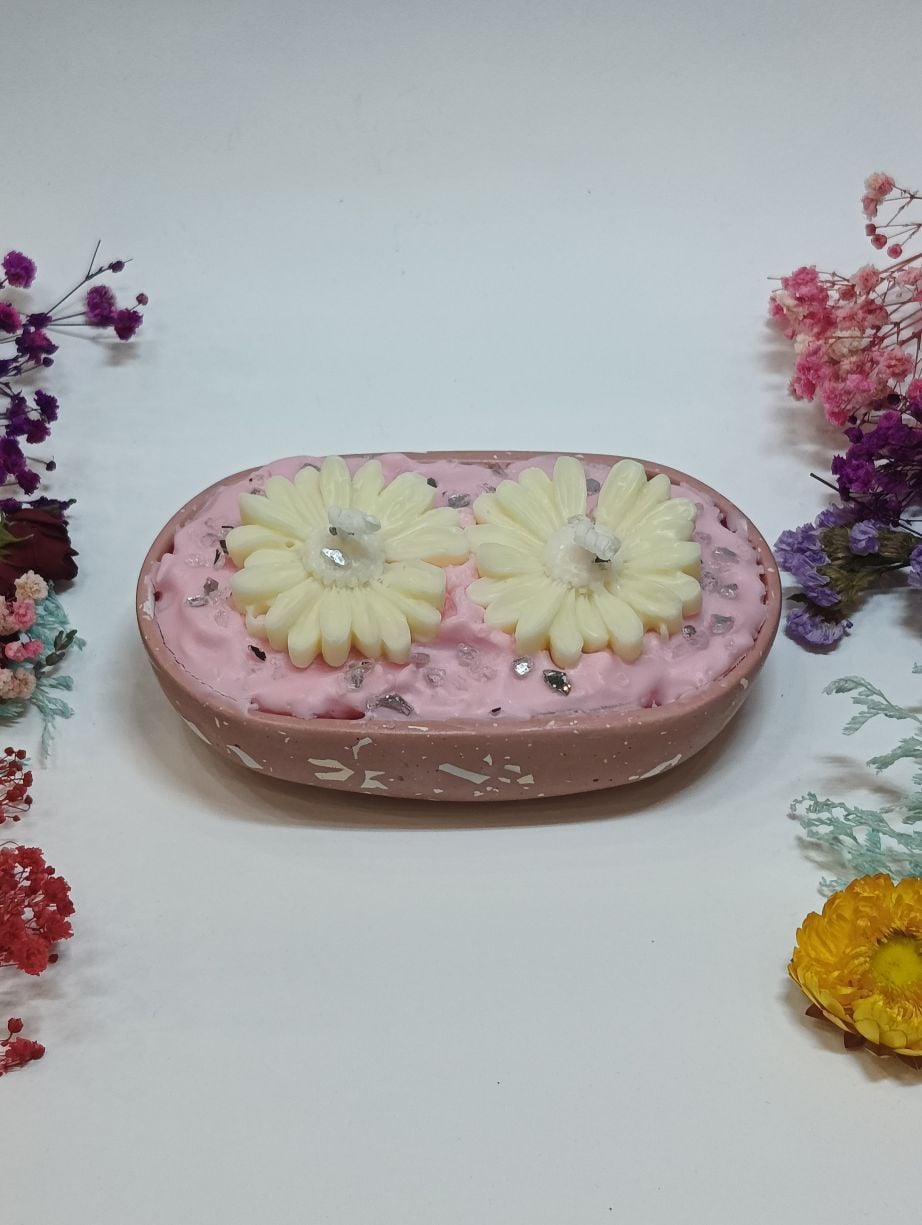 Το δοχείο, διαστάσεων 15cm μήκος, 9cm πλάτος και 3cm ύψος, είναι γεμισμένο με φυτικό αρωματικό κερί σε διάφορες επιλογές αρωμάτων, προσφέροντας μια ευχάριστη και ζεστή ατμόσφαιρα. Η επιφάνειά του διακοσμείται με κέρινα διακοσμητικά στοιχεία – όπως λουλούδια – φτιαγμένα επίσης από φυτικό κερί, που προσθέτουν ιδιαίτερη υφή και αισθητική.