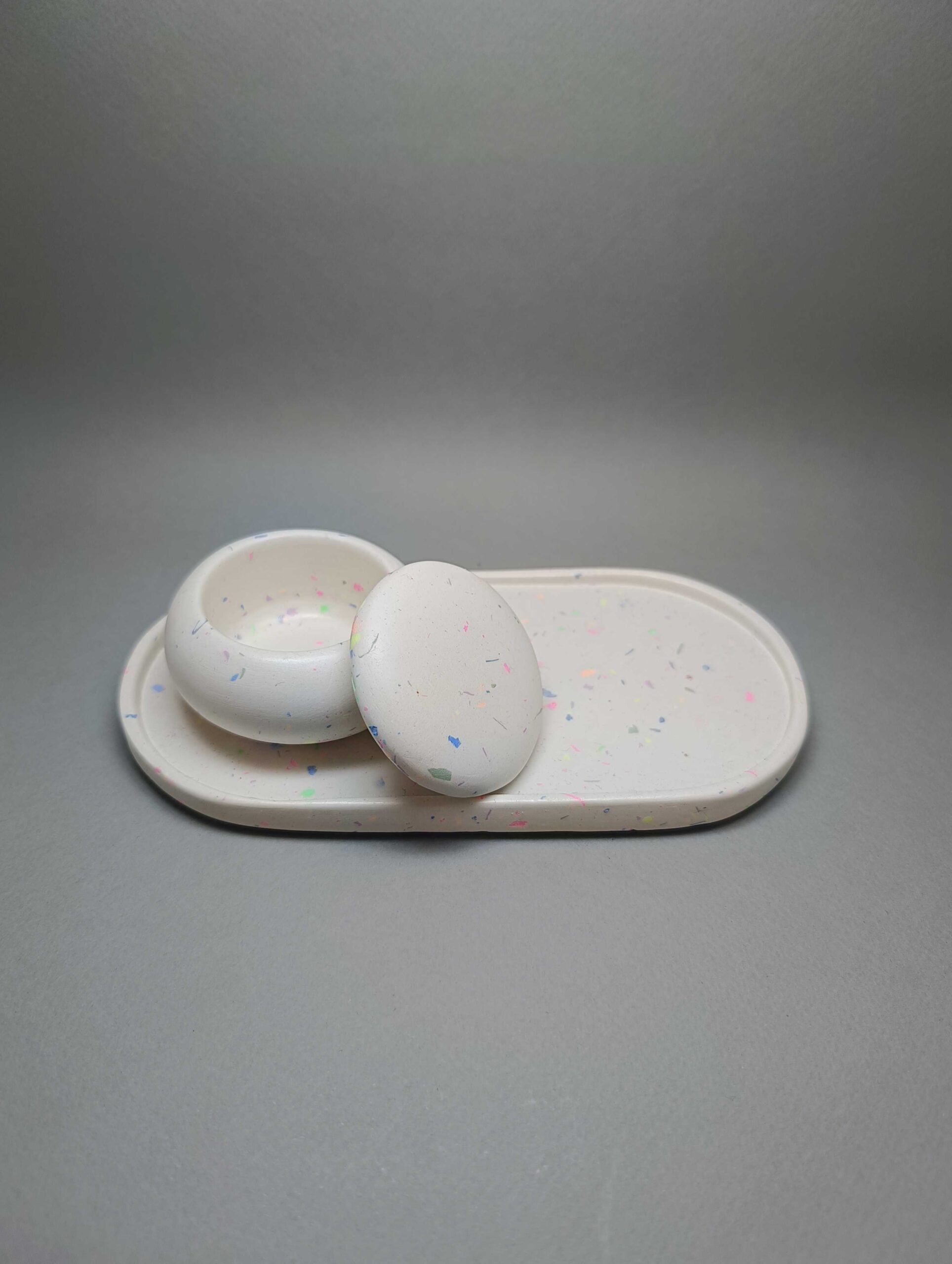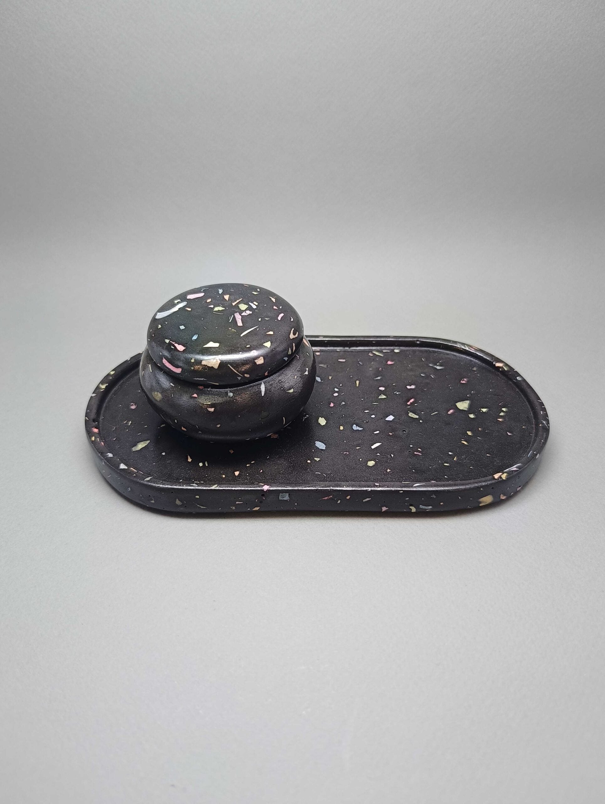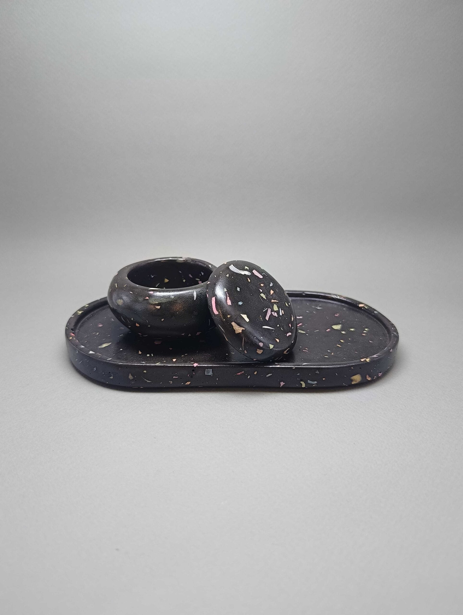 Χειροποίητο σετ 2 τεμαχίων από πορσελάνη σε μορφή μωσαϊκού. Αποτελείται από την κλασική αλλά πανέμορφη οβάλ βάση και το αγαπημένο σε όλους βαζάκι macaron. Προσδίδει στον χώρο κομψότητα και καλαισθησία. Ταιριάζει σε κάθε στυλ διακόσμησης.