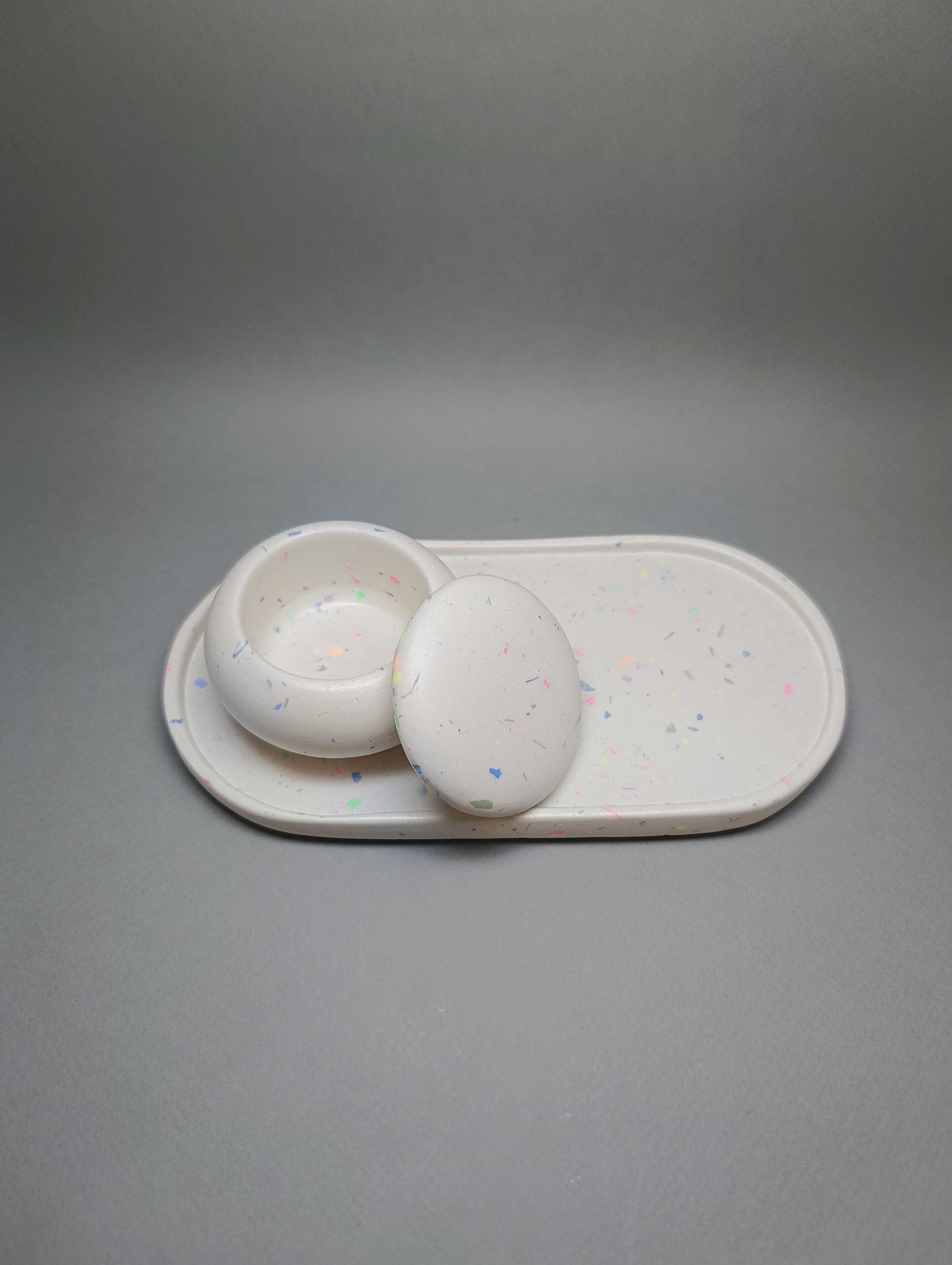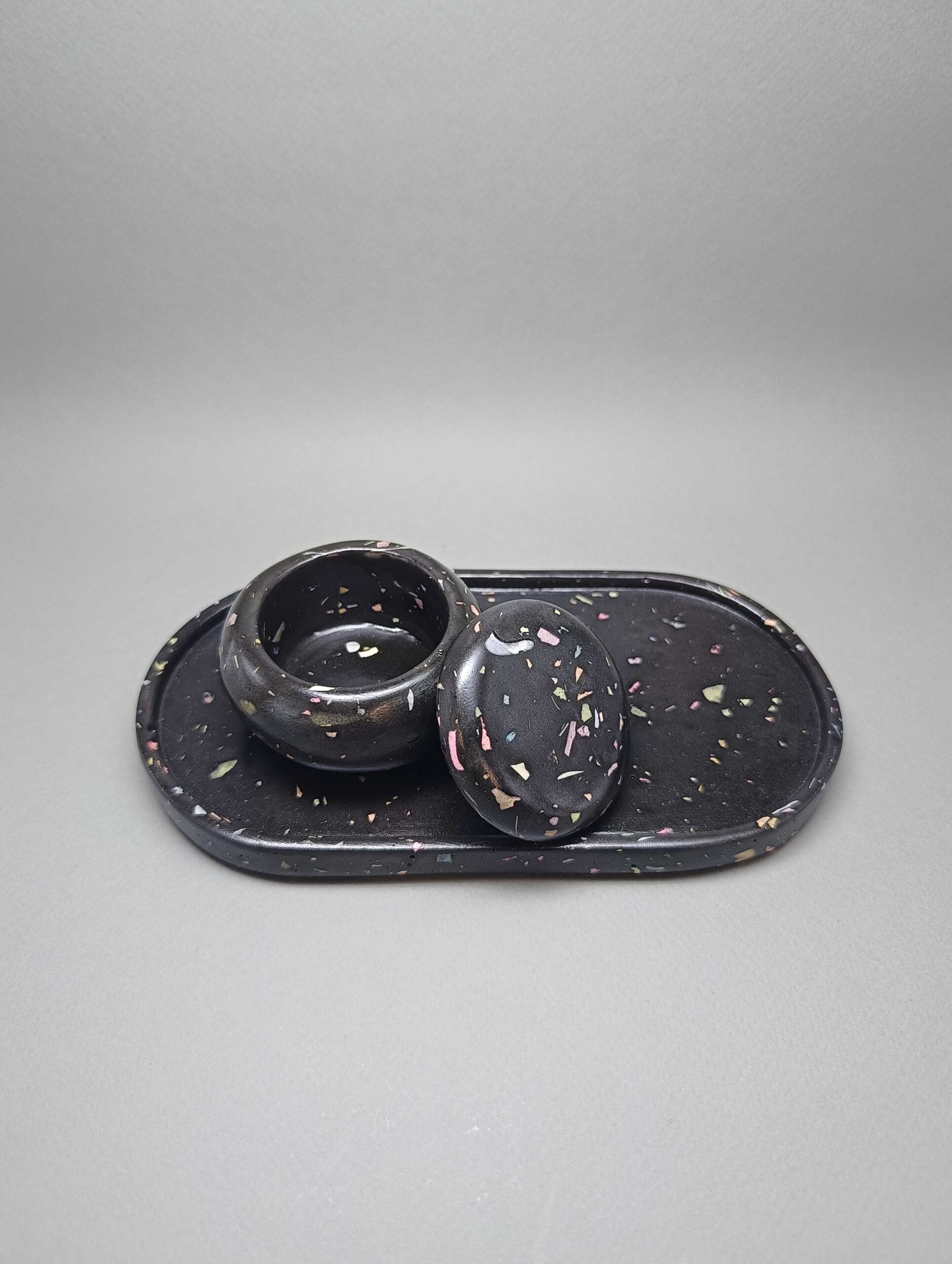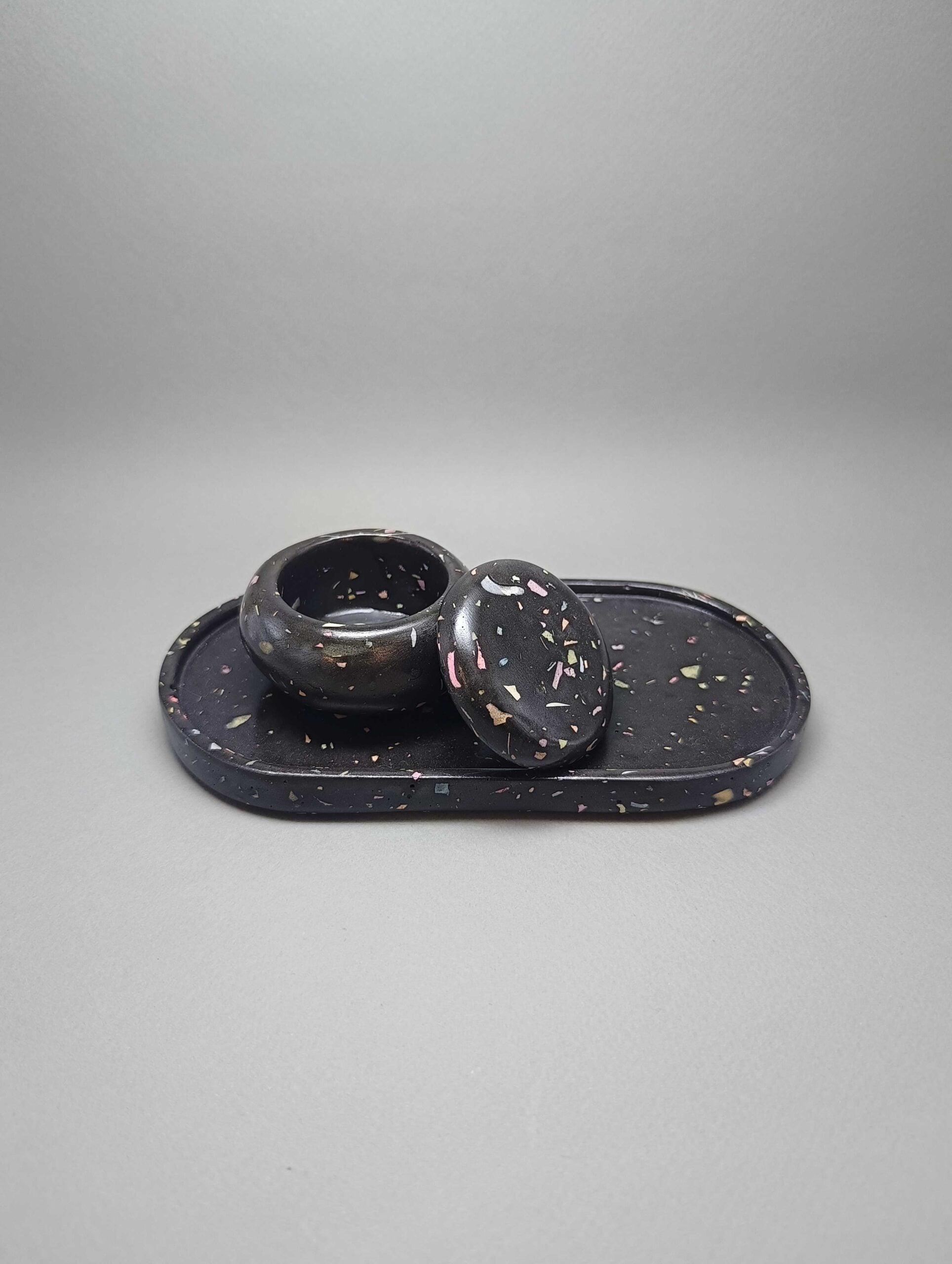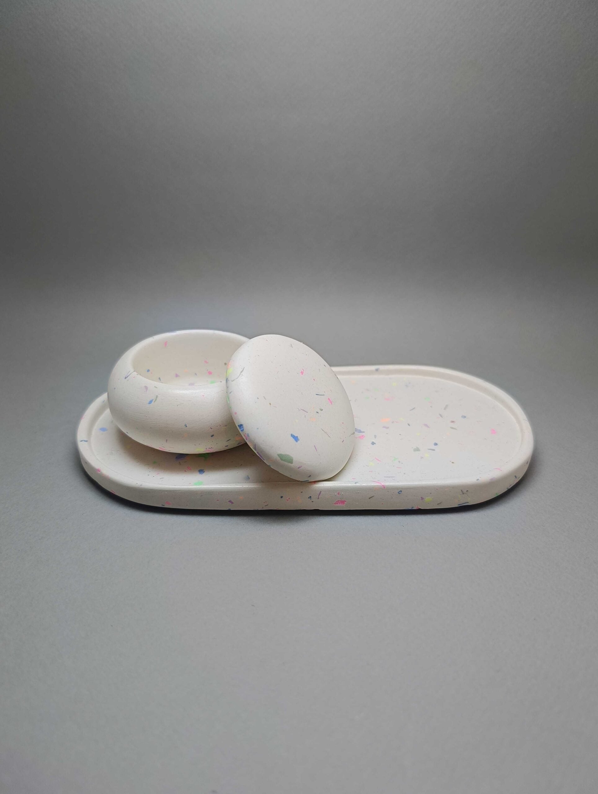 Χειροποίητο σετ 2 τεμαχίων από πορσελάνη σε μορφή μωσαϊκού. Αποτελείται από την κλασική αλλά πανέμορφη οβάλ βάση και το αγαπημένο σε όλους βαζάκι macaron. Προσδίδει στον χώρο κομψότητα και καλαισθησία. Ταιριάζει σε κάθε στυλ διακόσμησης.